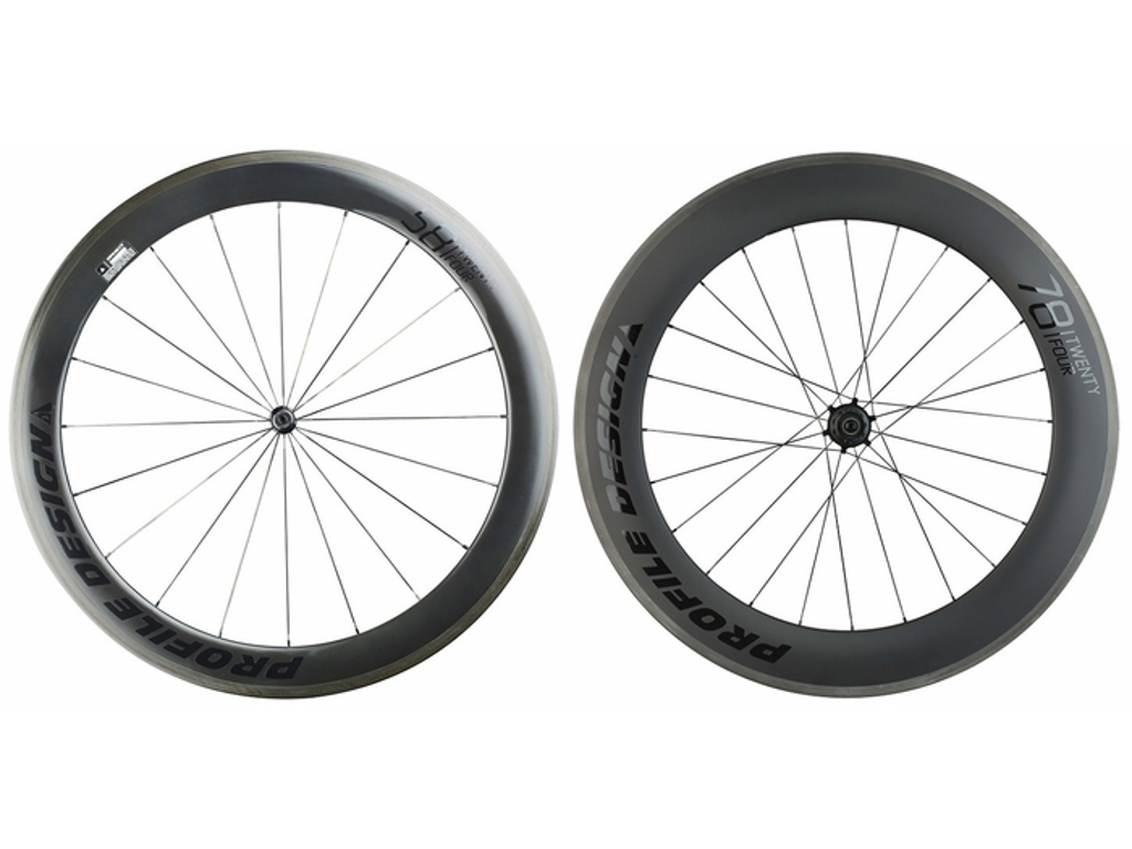 • "..the braking performance was virtually unchanged in transitions from dry to wet to monsoon left us all but astounded that these could be carbon brake track wheels, and yet they were. In this case, “impressed” is too light a word—we were floored." - AeroGeeks.com 'First Ride' "Either Profile Design equipped these wheels with tiny motors or they’re naturally disconcertingly quick...We aren’t sure what mojo Profile Design has worked on the braking surface of the 24 Series, but we are reasonably certain that it involves black magic." - AeroGeeks.com 'Final Thoughts' "Most brands offering aero wheels at this price range all cheapen wheel construction to drop the price tag; Profile Design builds its relatively affordable aero wheel with the same all-carbon construction of the most expensive options." -2014 Triathlete Buyer's Guide 220Triathlon names TwentyFour Series wheels the BEST BUY of 2014 2014 LAVA Magazine Gear of the Year nominee "These wheels have one speed. FAST." - SpeedTheory's Environmental Testing Project pit our TwentyFour Series wheelsets against some of the most popular wheels on the market on some of the most popular race courses in the world. Conclusion? The TwentyFour Series will get you to the finish first. "Stopping power is fantastic with a strong initial bite and minimal fading. For [the great price], you’d be hard pressed to find a better set of race day wheels." - Triathlete.com